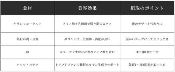 表1:夜のタンパク質美容におすすめの食材と摂取ポイント一覧