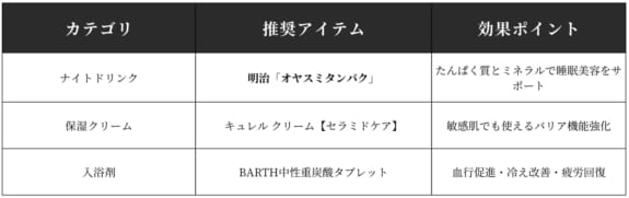 🛁おすすめ成分:セラミドNP・NG(角層バリア強化)、シアバター(保湿持続力)、マグネシウム入り入浴剤(筋肉リラックス)