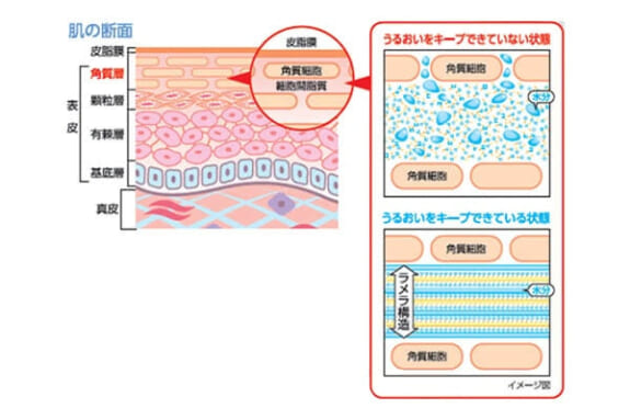 肌の最前線にある角質層には、細胞間脂質(セラミドなど)によるラメラ構造が存在し、水分を保持しながら外的刺激から肌を守っています。しかし、冷気や暖房の乾燥、睡眠不足、ストレスなどでこのラメラ構造が乱れると、バリア機能が弱まり、水分が逃げやすく刺激を受けやすい状態に。