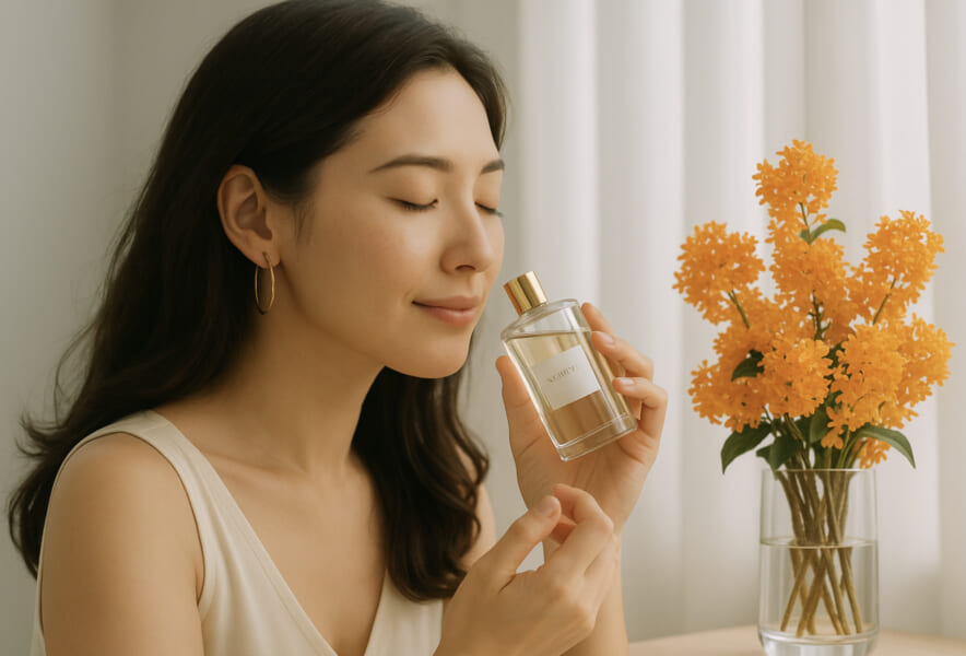 夜のスキンケアをただの作業で終わらせず、“自分を整える時間”に変えるために効果的なのが、この「香り深呼吸」です。クレンジングを始める前に、手やルームミストに金木犀の香りをひと吹きし、ゆっくりと深く息を吸い込むだけでOK。金木犀に含まれるリナロールの香り成分が嗅覚を通じて脳に届き、副交感神経を優位にする準備が始まります。