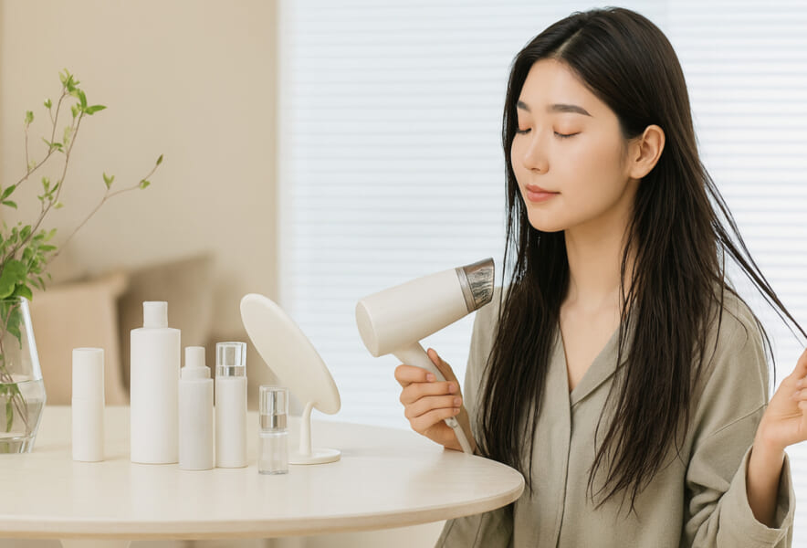 ドライヤーは温風で約8割乾かした後、最後に冷風でキューティクルを閉じると、ツヤと手触りが格段に向上します。
