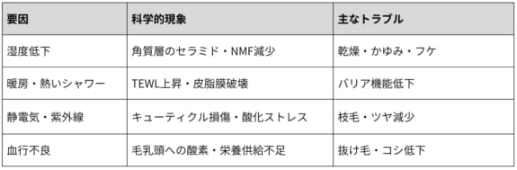 表1:冬の髪と頭皮に起こる「4つの科学的ストレス要因」
